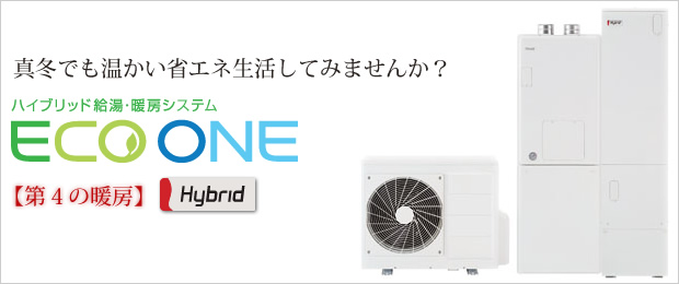 ECO ONEは、効率よくお湯をつくる電気のヒートポンプとパワフルで湯切れのないガスのエコジョーズを組み合わせた、これまでにない給湯・暖房システムです。