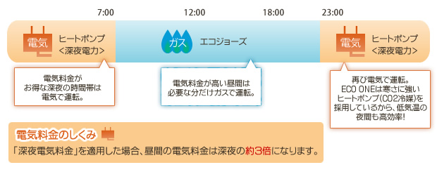 電気はお得な深夜料金の時間帯にメインで動き、昼間はガスがサポートします。