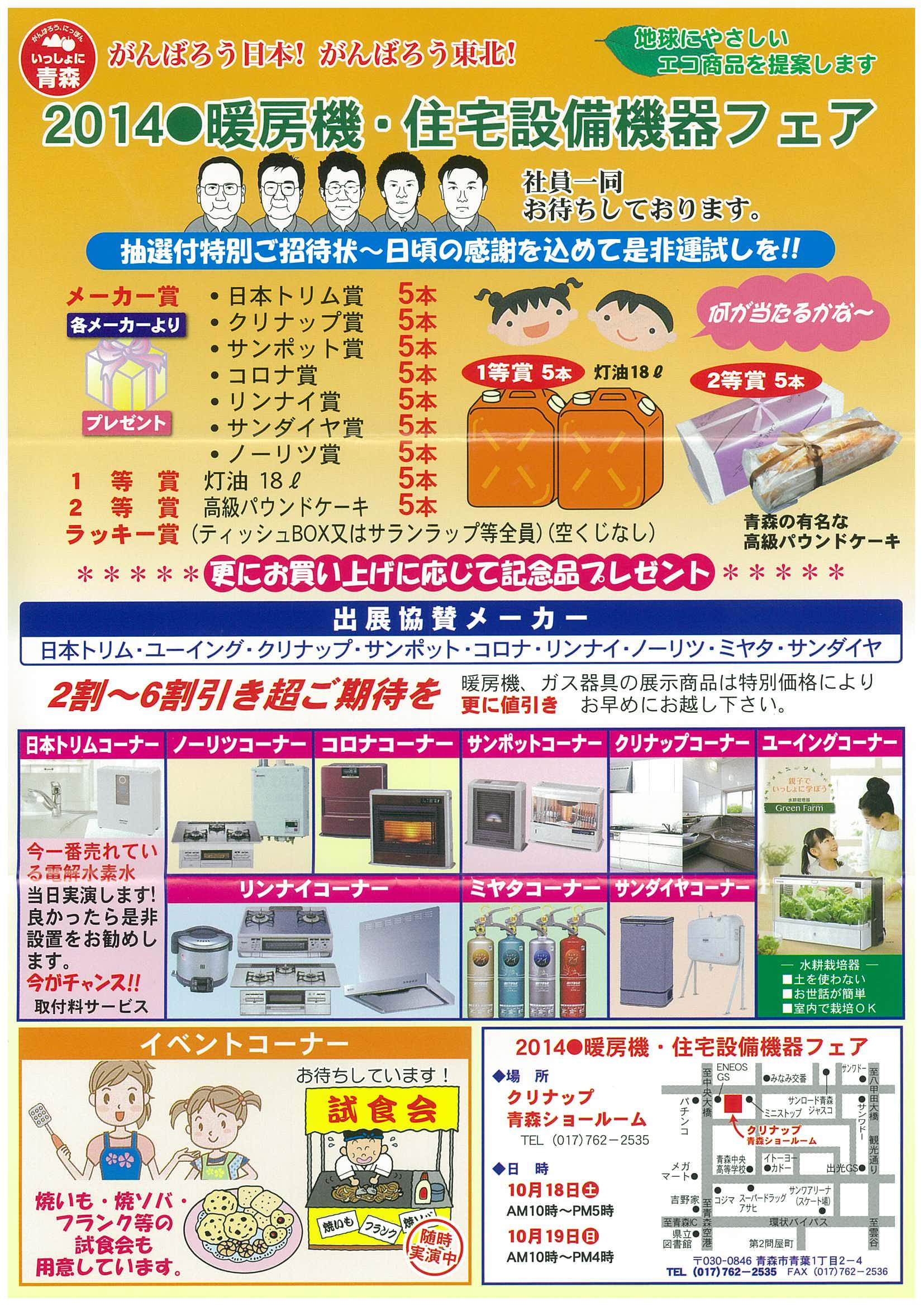 さいとうガス鰍ナは10月18日(土)・19日(日)10:00〜17:00の二日間、青森市青葉(みやきん)さんの隣りにあるクリナップショールームをお借りして2014・暖房機、住宅設備機器フェアを開催いたします。