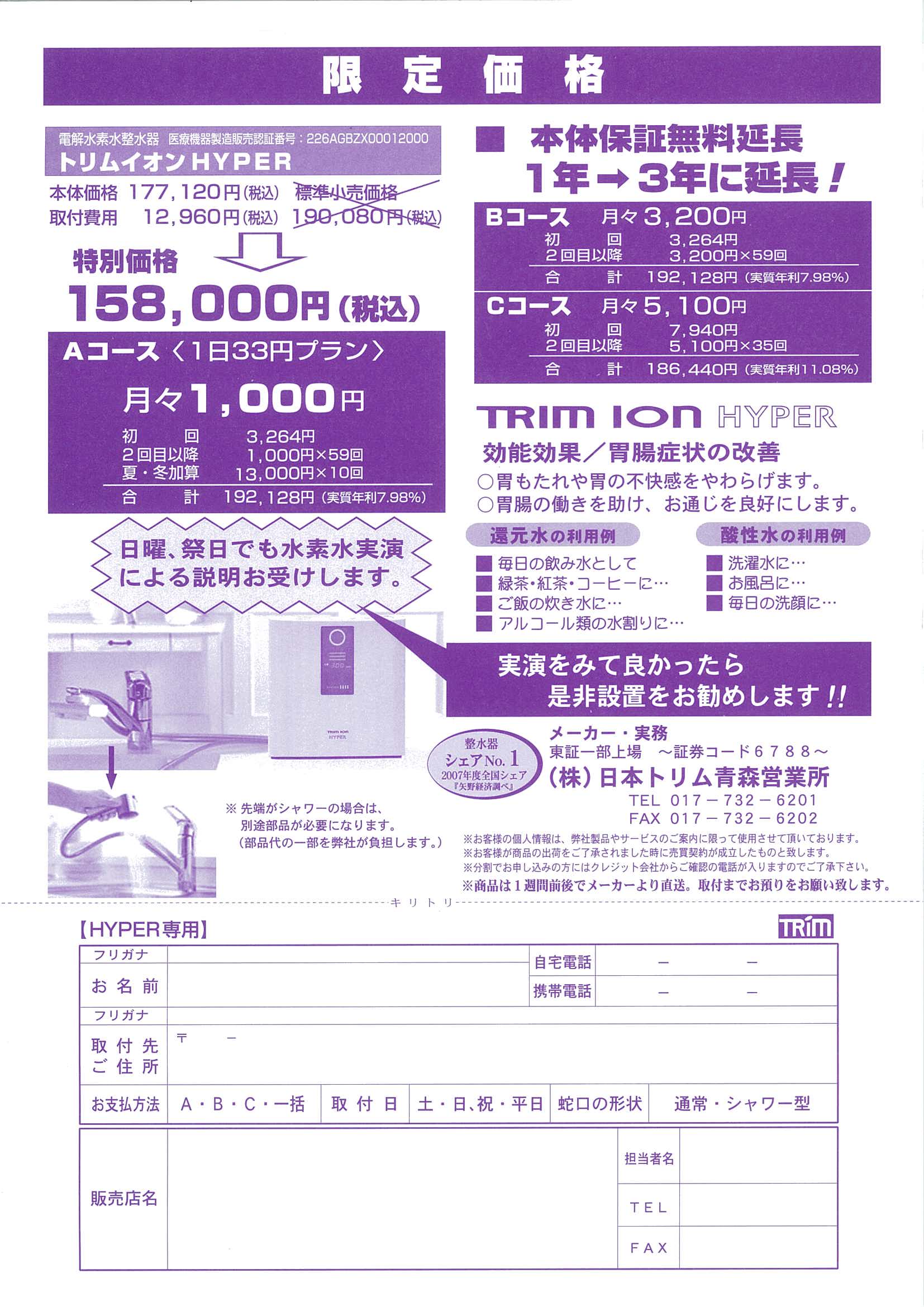 連続生成型電解水素水整水器は11月末まで限定特別価格で販売しております。毎月のお支払いが楽なクレジットも用意してございますのでどうぞご検討下さい。